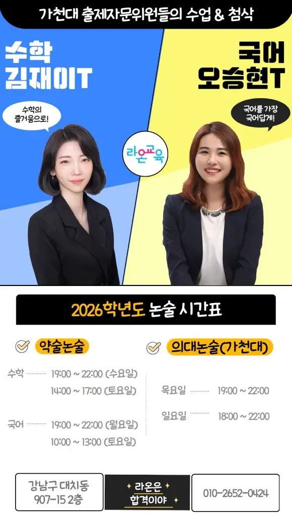 가천대 출제자문위원이 직접 이끄는 약술형 논술 전문 학원 가천대 출제자문위원의 철저한 첨삭이 약술형 논술 합격의 열쇠입니다. 소수정예 교육과 맞춤형 피드백으로 시험장에서 빛나는 자신감과 합격의 확신을 만들어 드립니다. 무료상담신청 약술형 논술이란? 약술형 논술의 정식 명칭은 교과형 논술이며,교과형 논술은 2022학년도부터 가천대학교를 시작으로 새로 생긴 수시 전형입니다.교과형 서술/논술형으로 출제되어 학생들의 부담이 적고,고교 교육과정을 충실히 받은 학생이라면 충분히 도전할 수 있는 전형입니다.교과형 논술의 준비는 기존의 수리논술처럼 논술을 따로 준비할 필요 없이EBS수능연계교재를 활용하여 출제되어 학생부 교과와 수능 대비를 동시에 할 수 있다는 장점이 있습니다.약술형 논술의 출제 과목은 보통 국어, 수학입니다.국어는 지문의 내용을 요약 및 정리하여 핵심어를 찾아 쓰는 단답형 위주의 문항으로 출제되며,수학은 풀이과정에 중점을 둔 주관식 서술형으로 출제됩니다. 왜 라온교육일까요? 1 가천대 출제자문위원 직강 22학년도부터 가천대 수리논술, 국어논술, 의대논술 출제자문위원이 직접 수업과 첨삭을 담당합니다. 2 소수정예 맞춤형 교육 철저한 첨삭을 위해 소수 인원만 모집하여 개인별 맞춤 교육을 제공합니다. 3 합격의 핵심, 철저한 첨삭 모든 문제를 대표 강사가 직접 첨삭하여 시험장에서의 자신감을 키웁니다. 2026학년도약술형 논술개강 시간표 학원 위치 및 문의 전화 010-2652-0424 주소 서울 강남구 대치동907-15 2층 BLOG 라온에듀 YOUTUBE @라온교육 INSTAGRAM @raon_edu